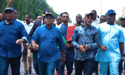 Led by the national chairman of the party, Prince Uche Secondus and other members of the NWC, the procession took off at the Legacy House as youths and women sang in solidarity with the party.
